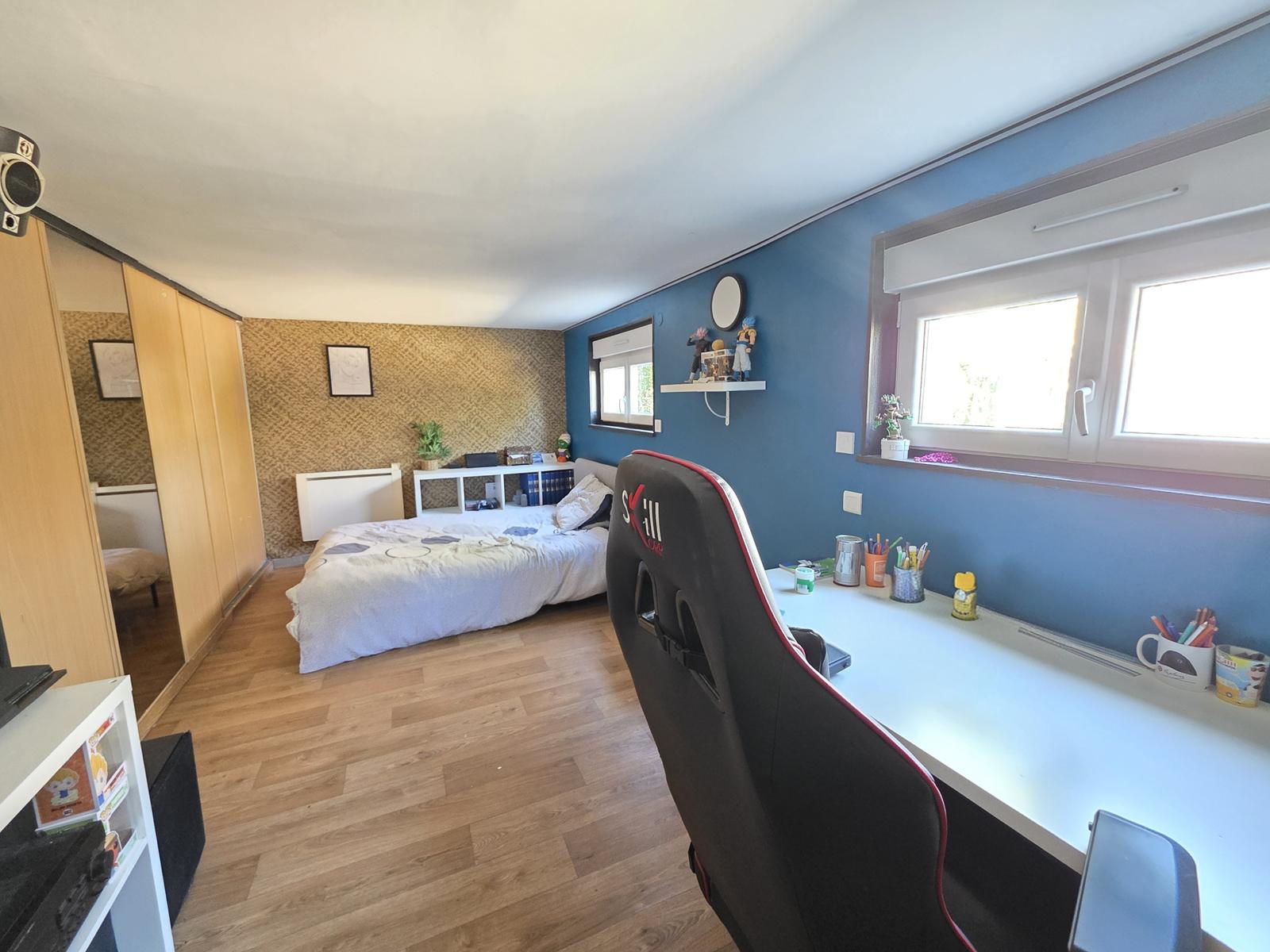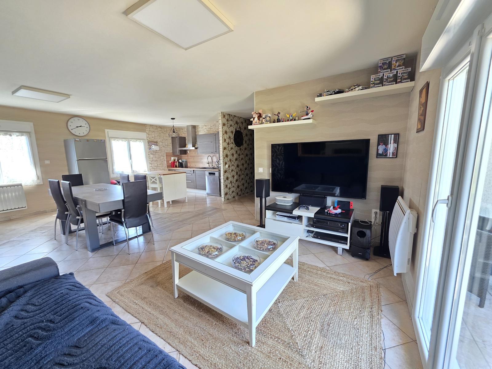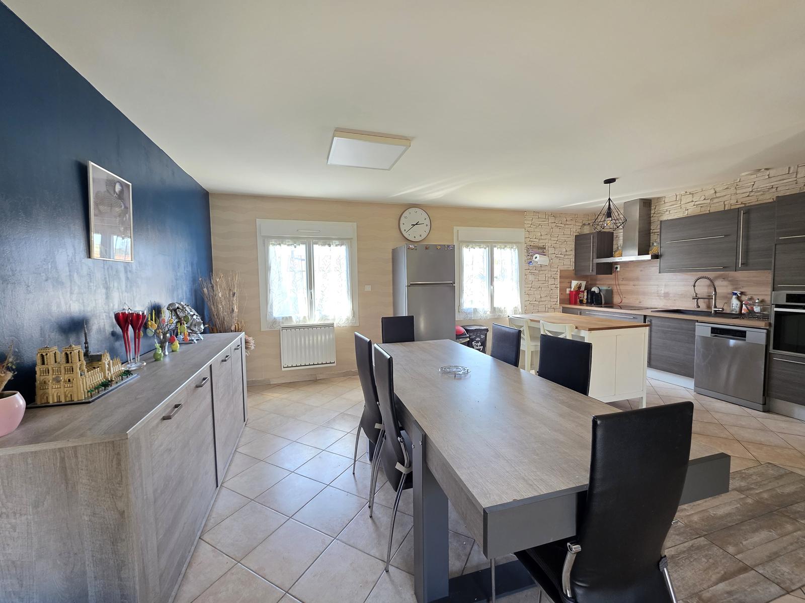 Maison comprenant une cuisine équipée ouverte sur séjour en accès direct sur terrasse, 5 chambres dont 3 sur le même niveau que les pièces de vie, 2 SdB, deux WC, une buanderie, et un grand garage.