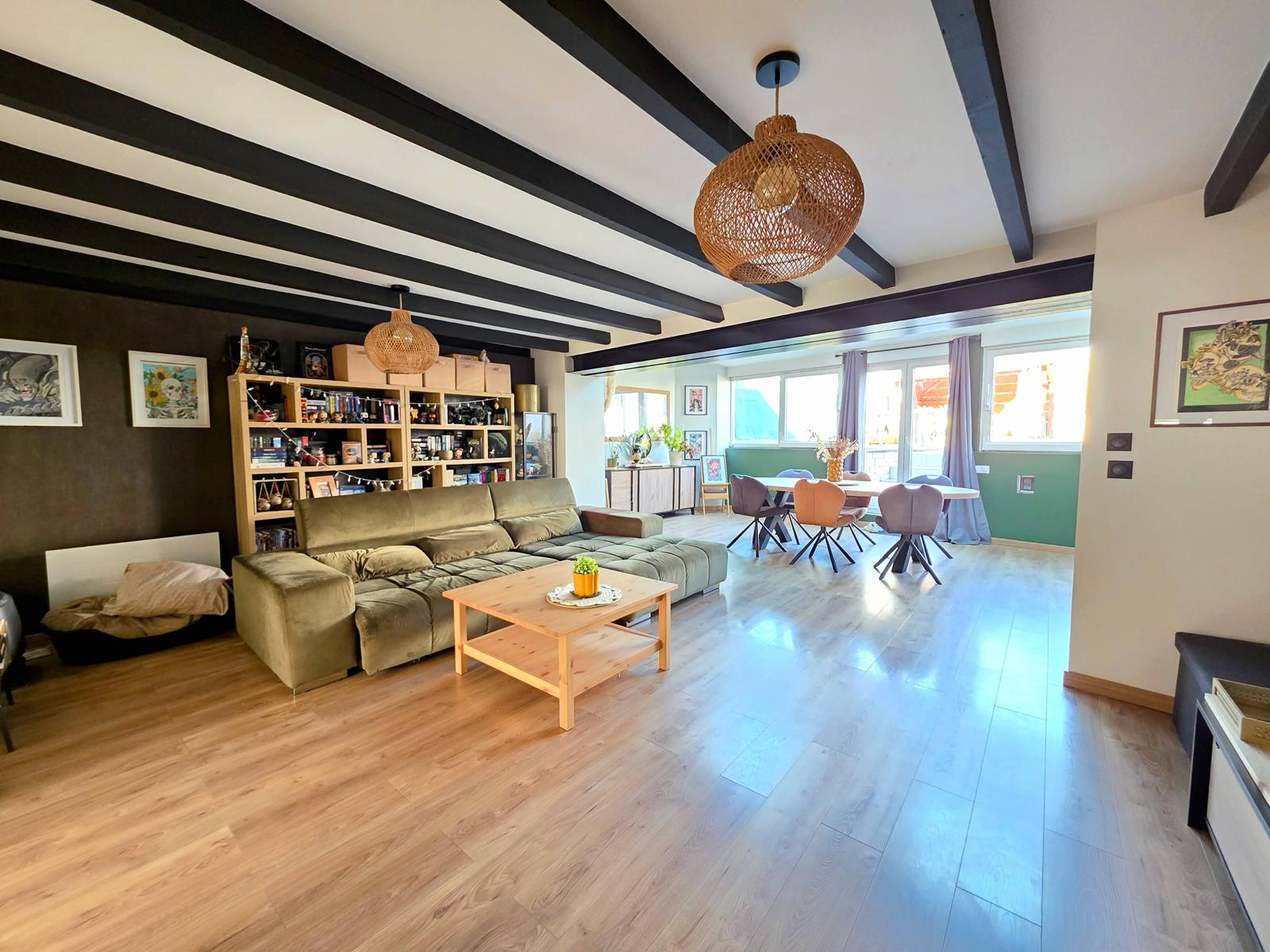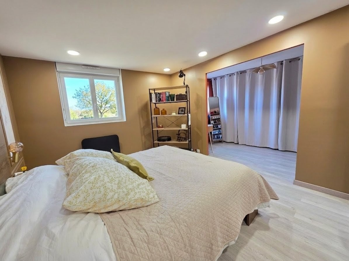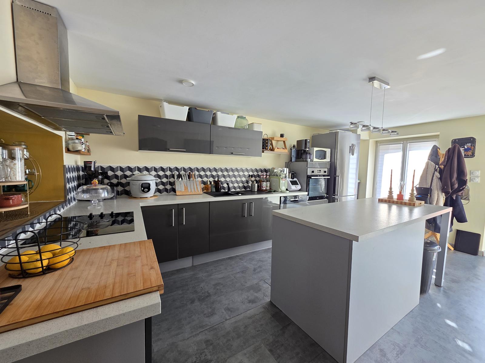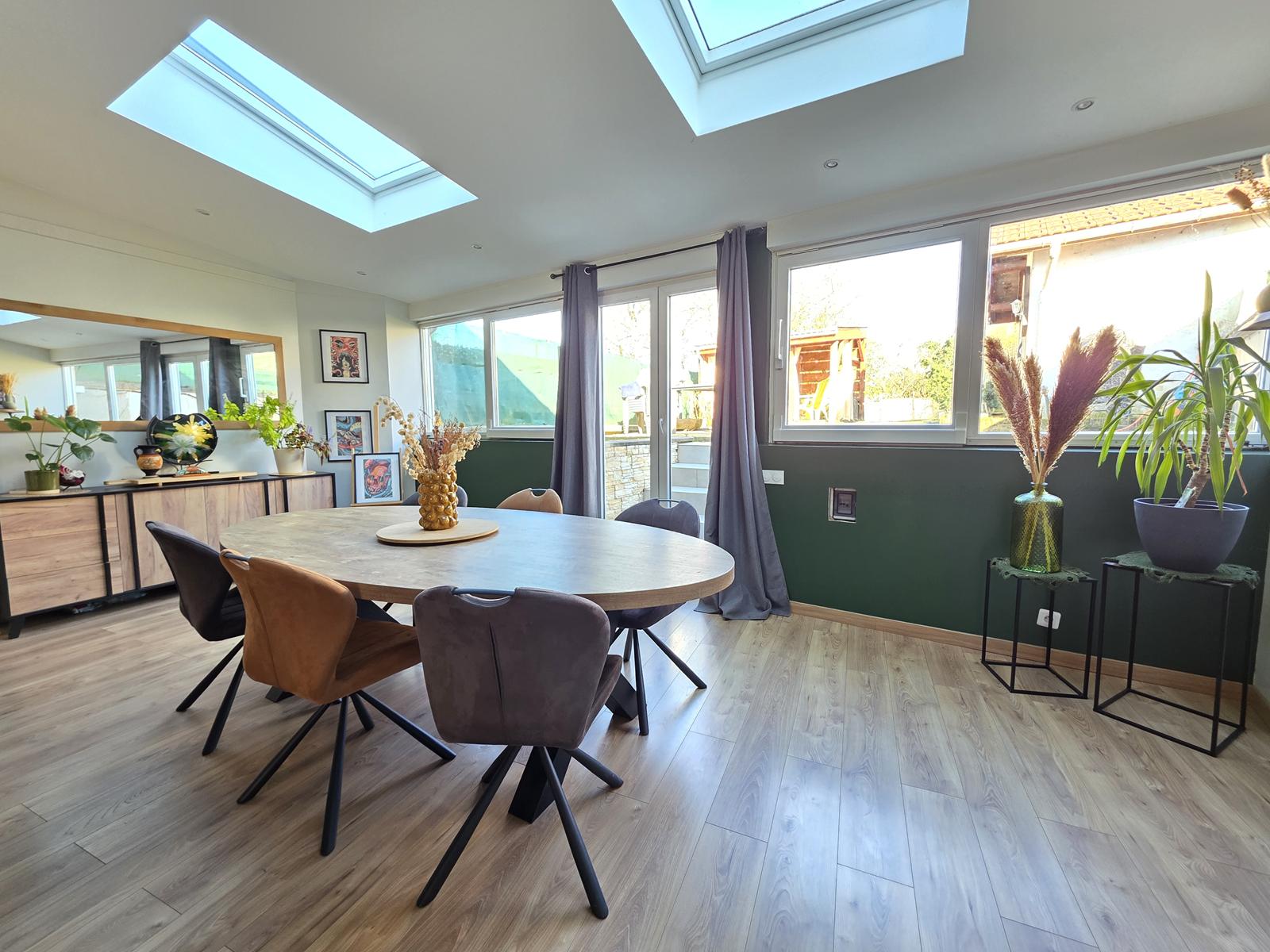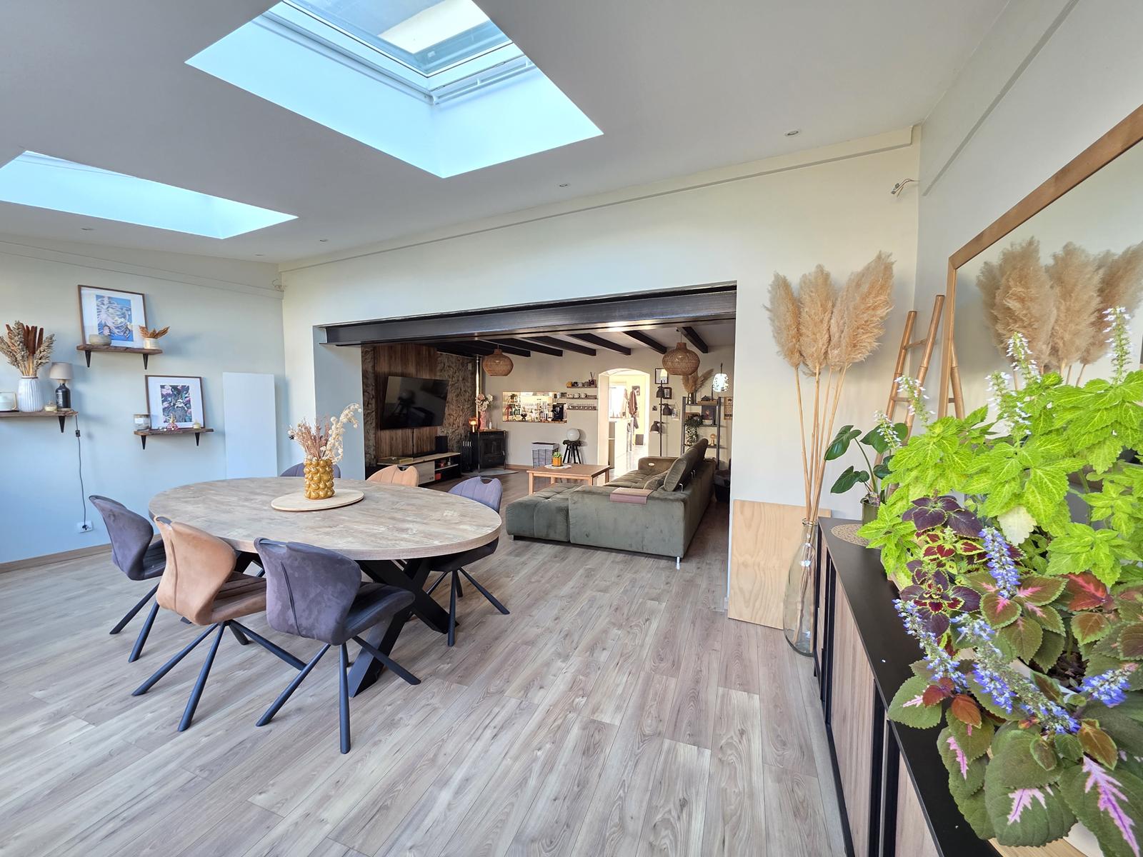 Maison comprenant une cuisine équipée ouverte sur grand séjour de plus de 45m² avec poêle à bois, en accès direct sur terrasse et jardin, 3 chambres, un bureau, SdB, WC séparé.