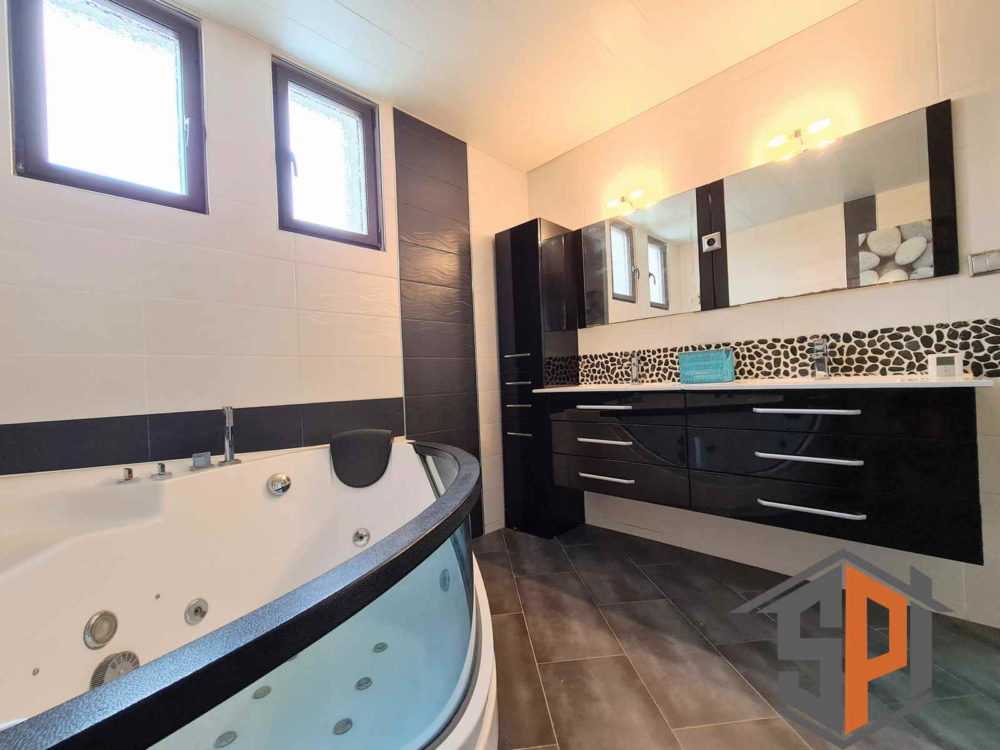 Au rez-de-chaussée, une cuisine ouverte intégrée sur salon séjour, salle de bain avec baignoire balnéo et douche à l’italienne, WC suspendu.
