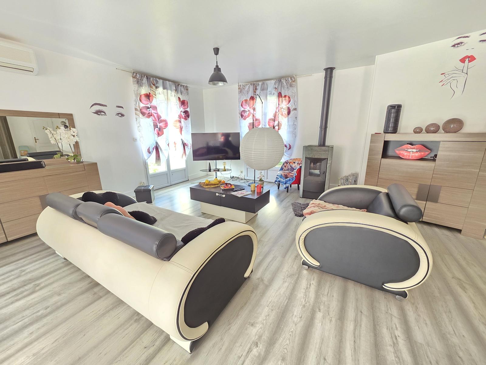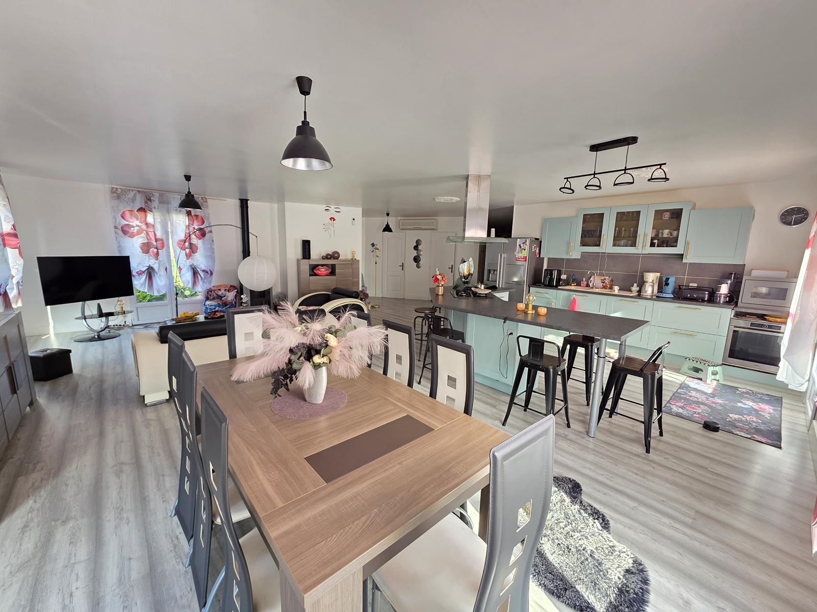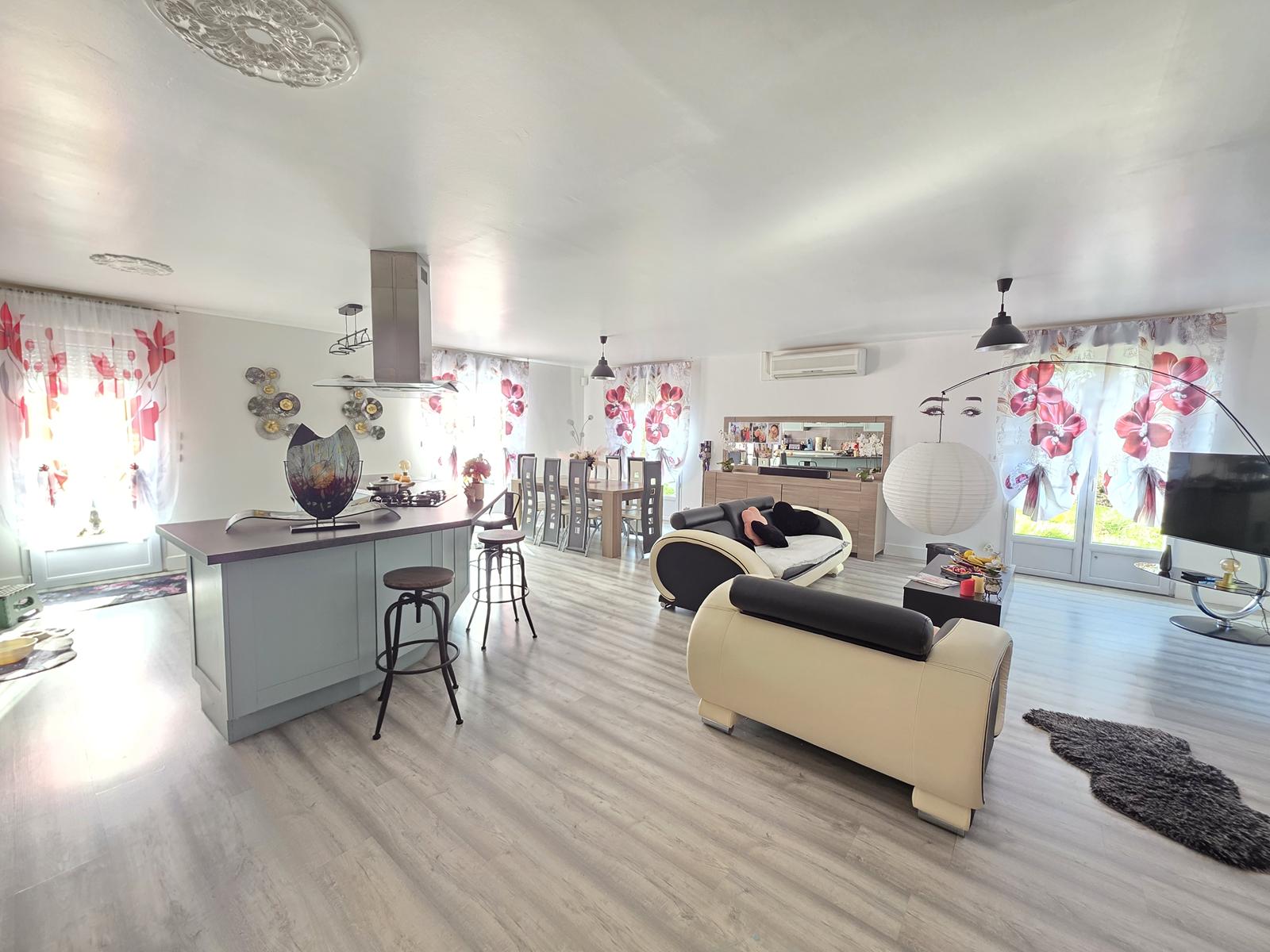 Maison de plain-pied comprenant une cuisine équipée ouverte sur grand séjour en accès direct sur terrasse, jardin et piscine. 5 chambres, une salle d’eau, WC séparé, un garage.