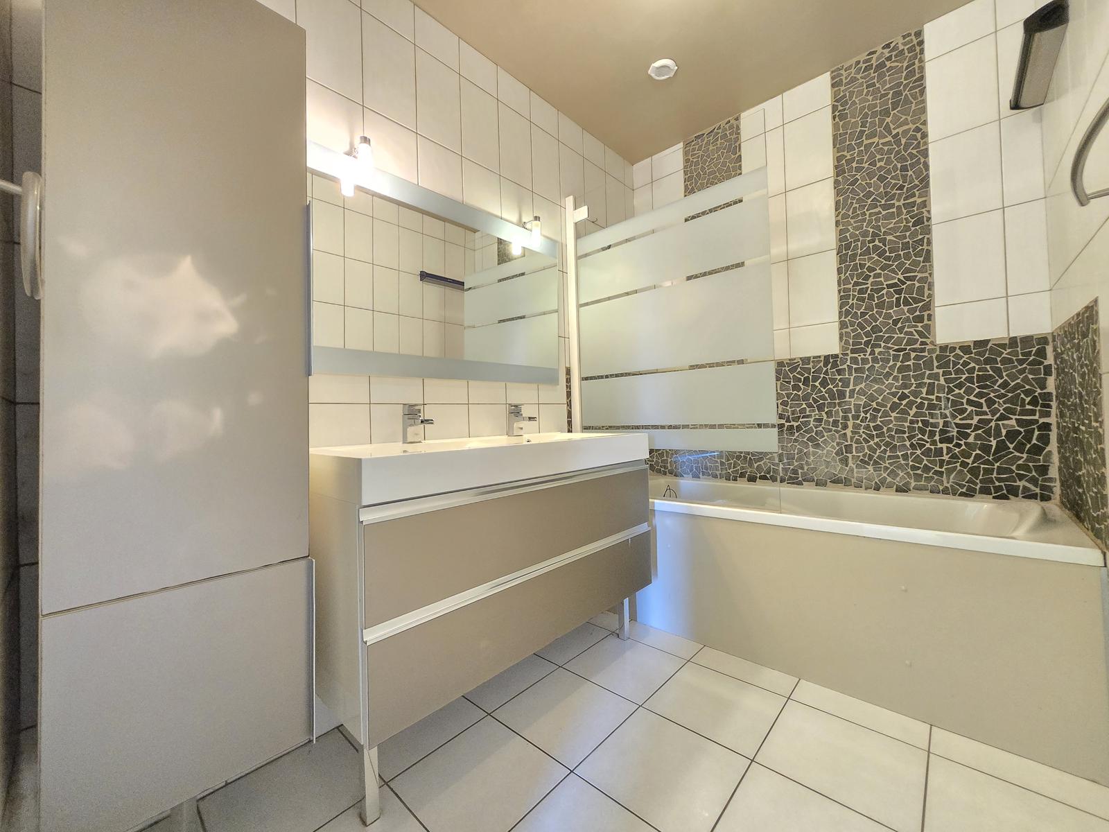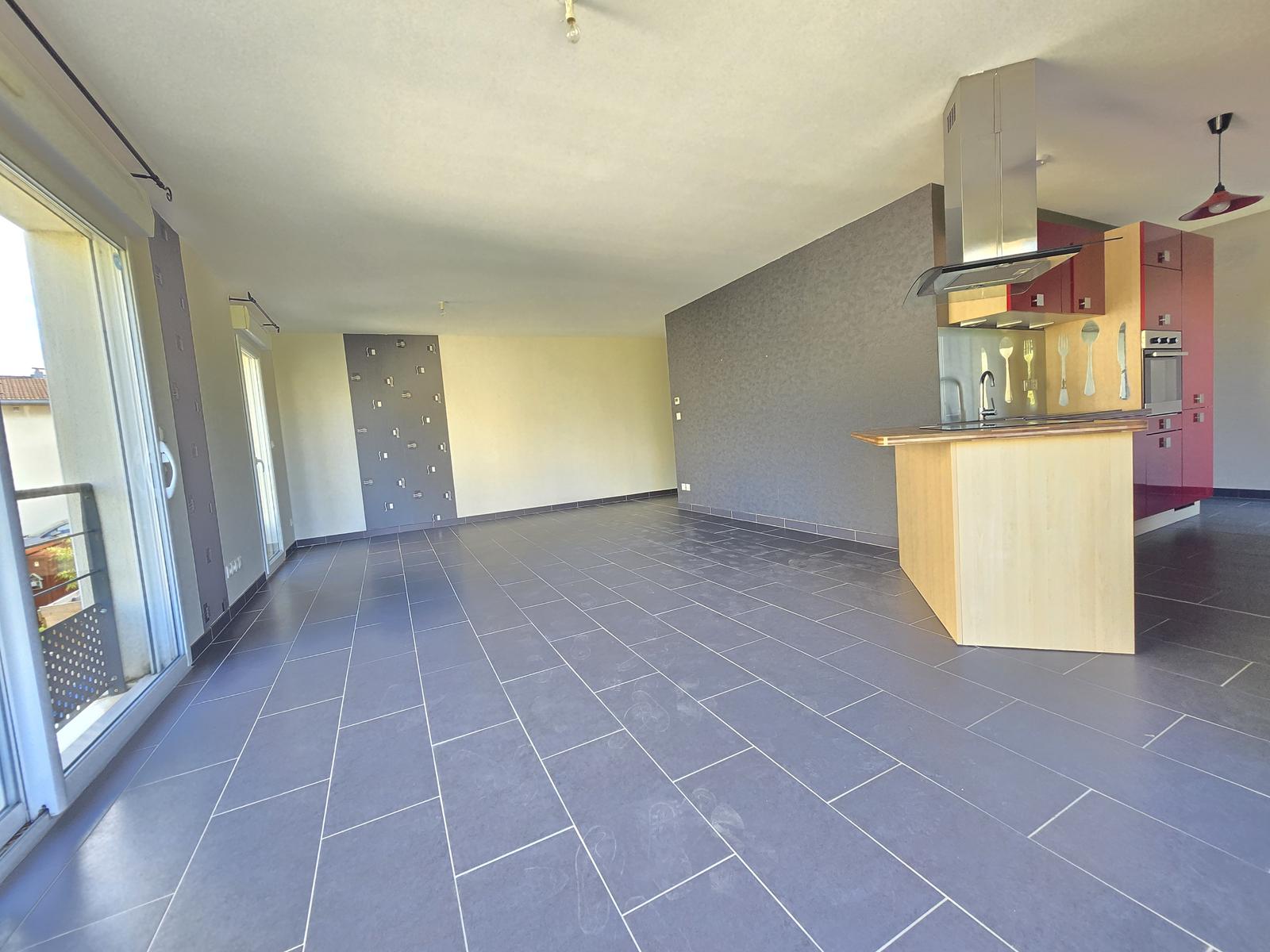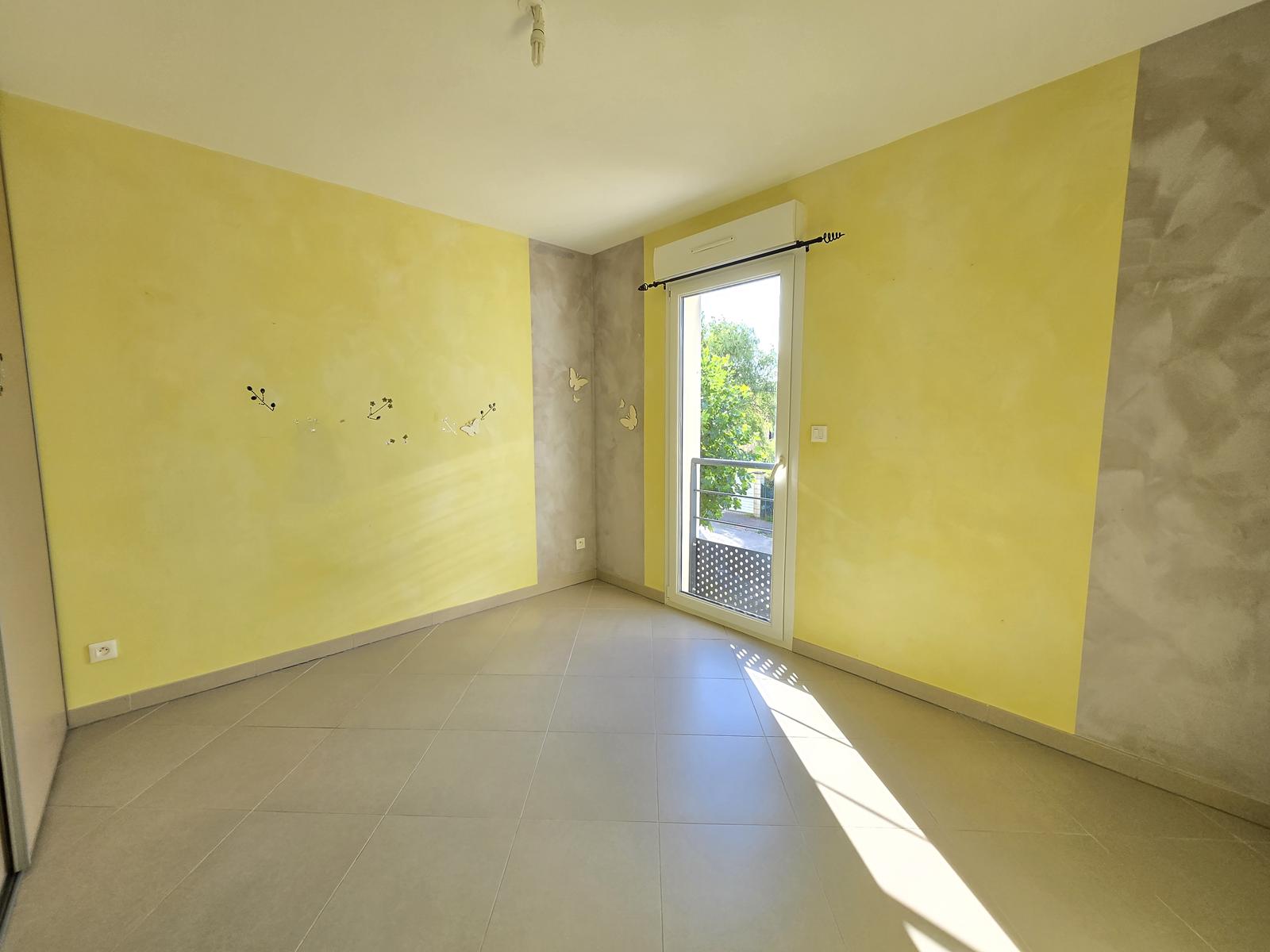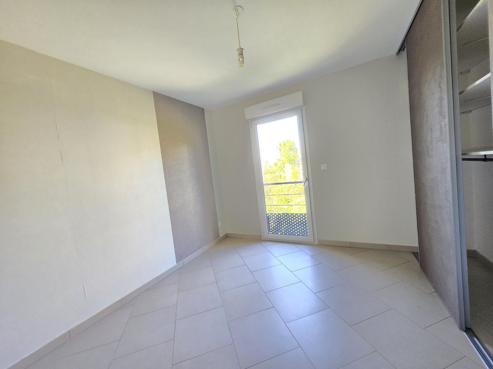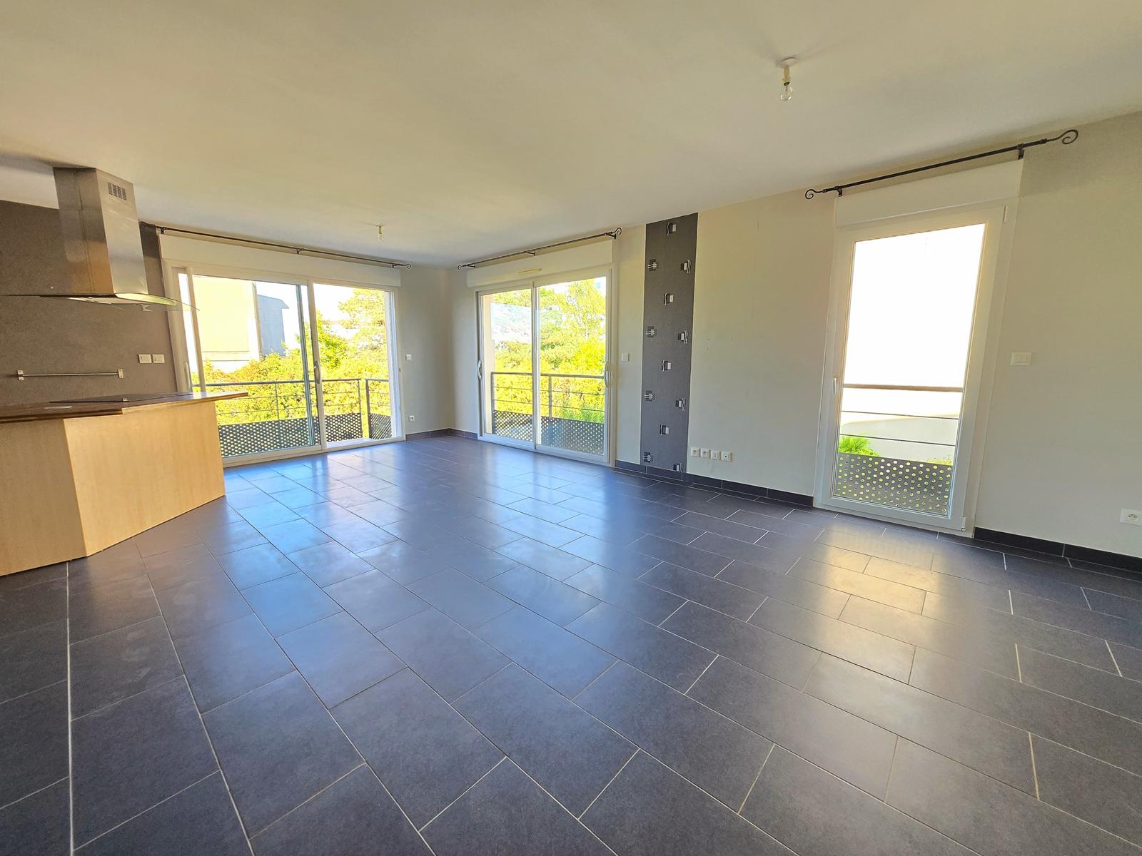 Appartement comprenant une entrée avec grand placard, une cuisine équipée ouverte sur séjour en accès direct sur balcon, 2 chambres avec placard intégré, salle de bain, WC séparé.